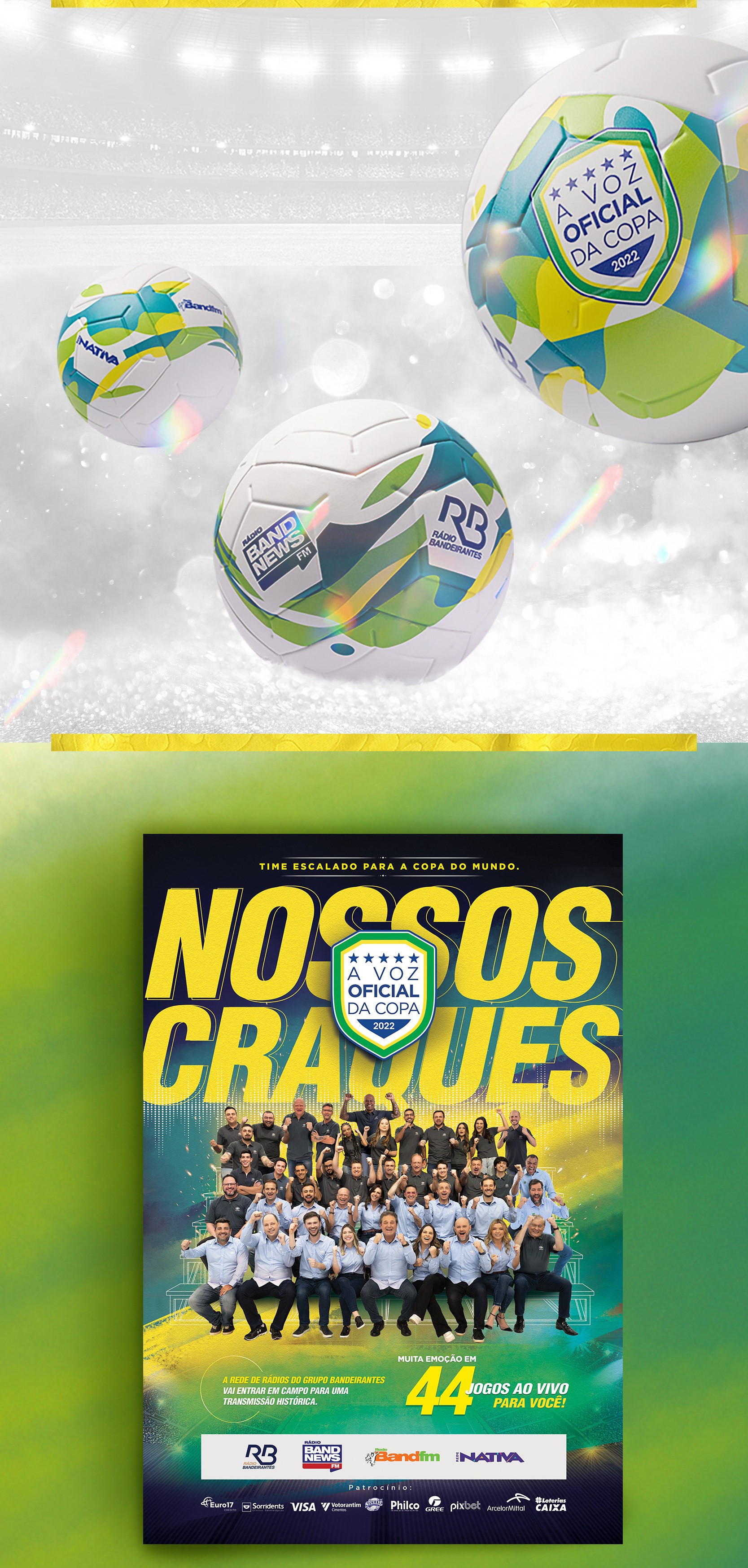 A entrega incluiu campanhas em jornais, revistas e OOH (mobiliário urbano), além de ativos exclusivos como uma bola personalizada da campanha e o álbum de figurinhas da equipe. Um design de grande escala para conectar a rádio ao público do maior evento do planeta.