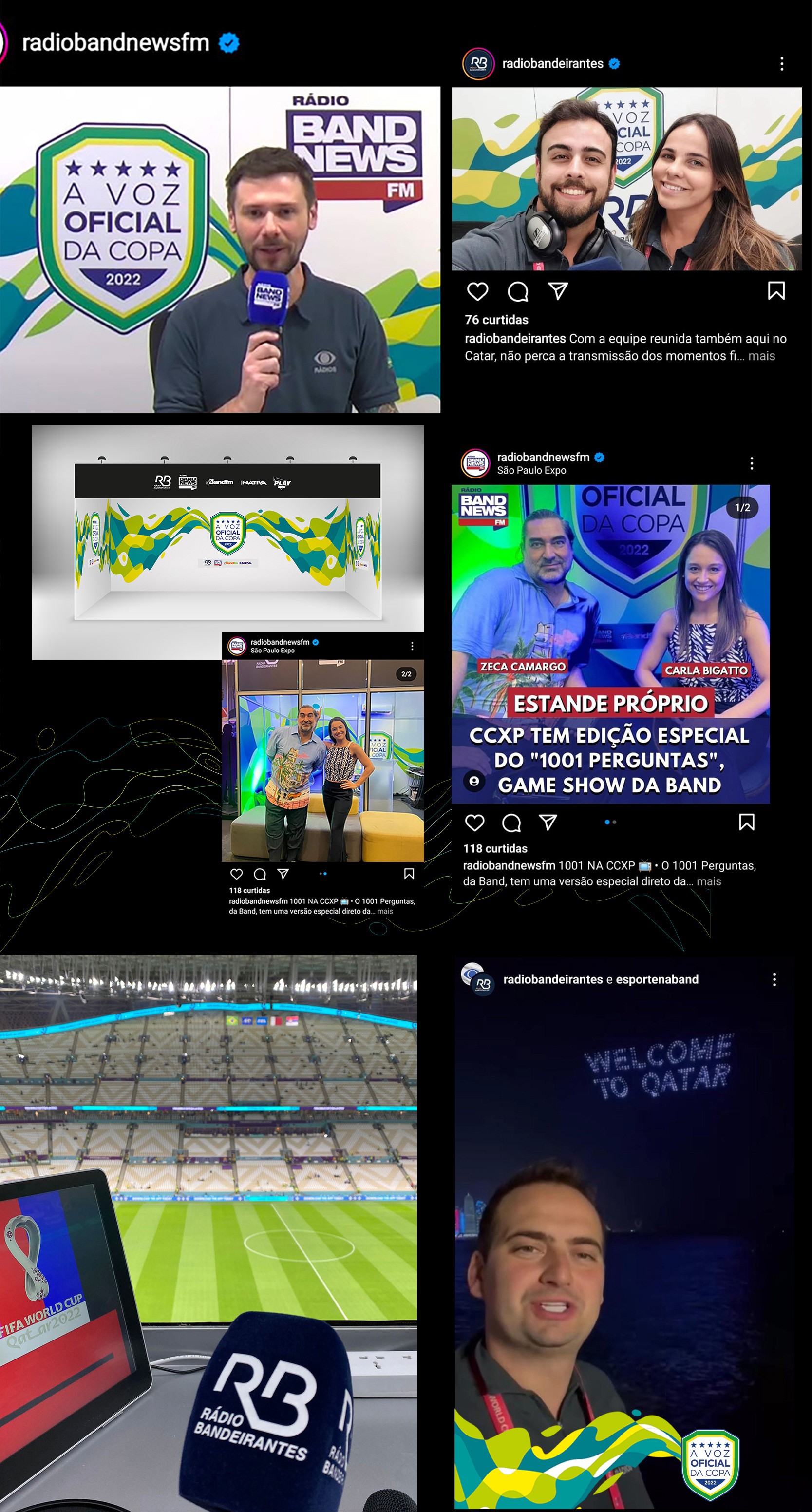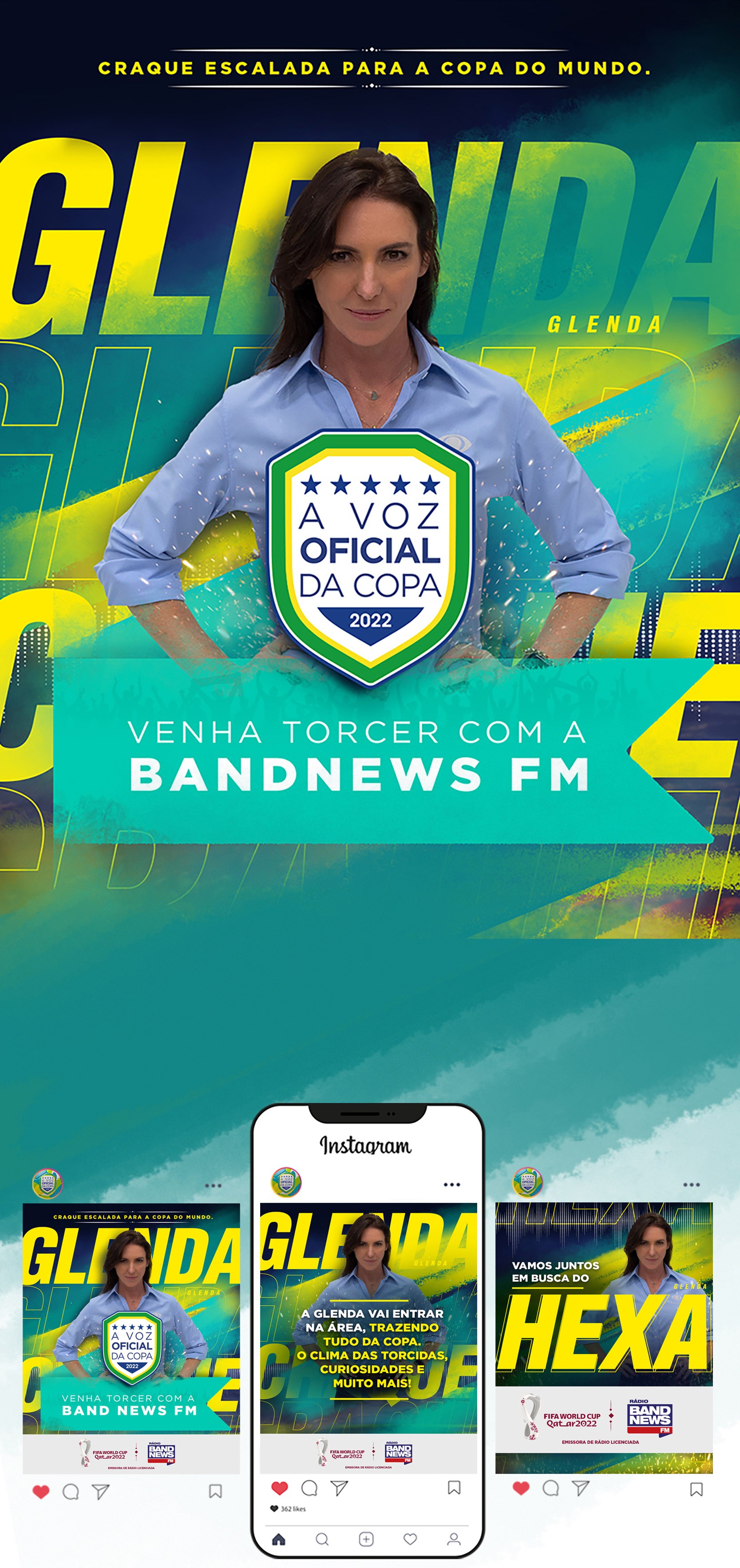 Como rádio oficial e autoridade máxima no esporte, a Rádio Bandeirantes exigia uma comunicação à altura de sua exclusividade. Desenvolvi a identidade 360 do projeto, abrangendo desde a ambientação do estúdio no Qatar até artes para transmissões ao vivo e posts animados.