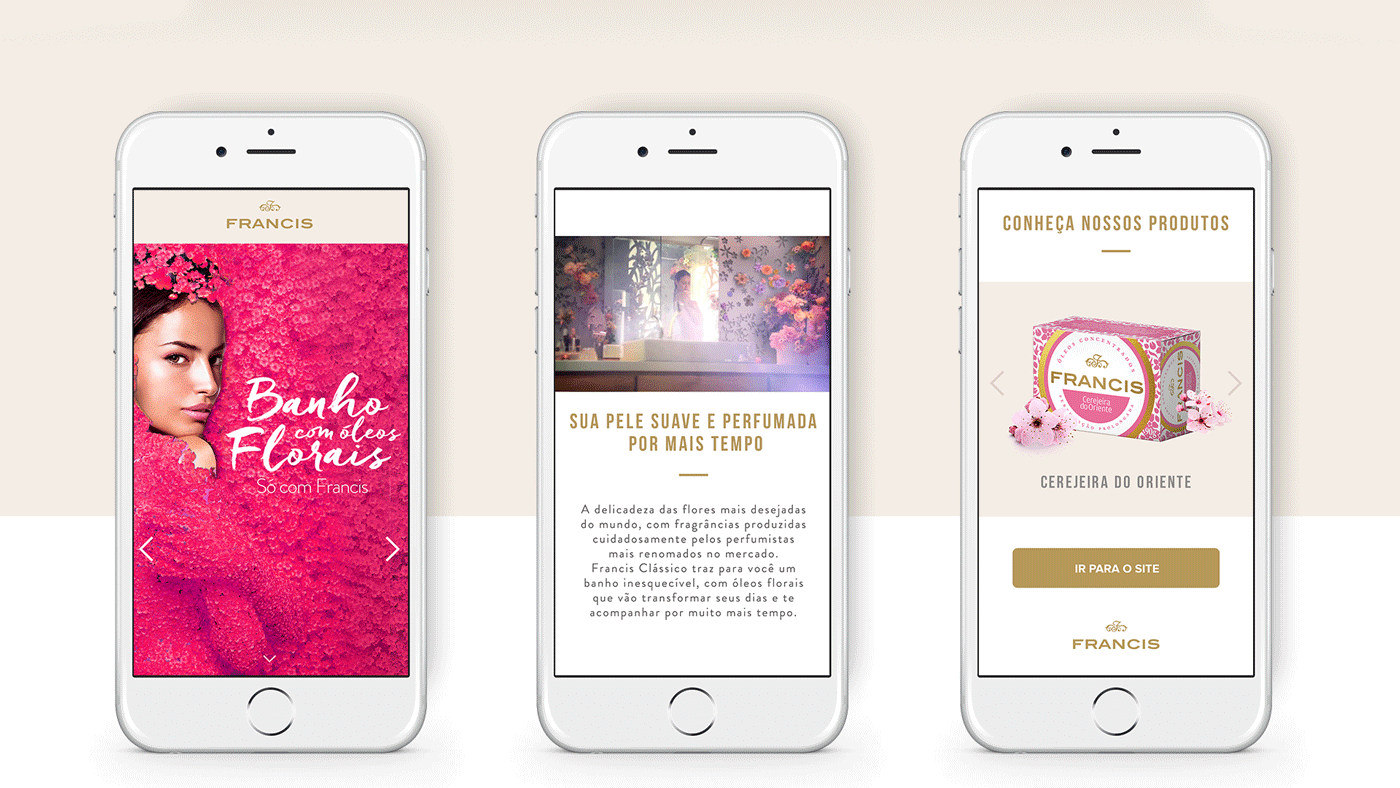 Para a marca Francis, participei do desenvolvimento do site focado em traduzir a sofisticação e a perfumação intensa de seus produtos para o ambiente digital. O projeto priorizou uma navegação fluida, utilizando elementos que reforçam o conceito de banhos florais e cuidado pessoal premium.